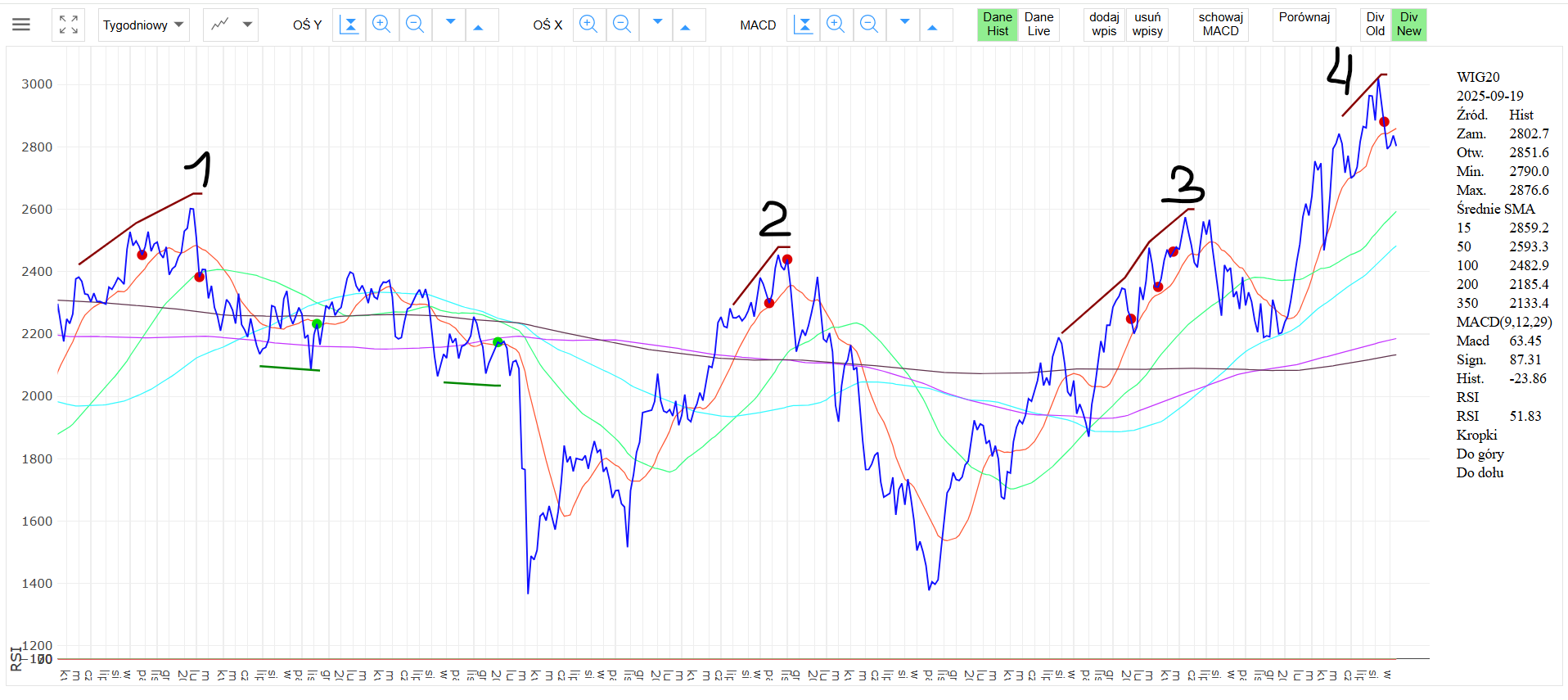 W załączniku numer 3 prezentujemy liniowy przebieg wykresu WIG20, w interwale tygodniowym. Jest to wykres z naszego, własnego systemu, którym wspomagamy naszą analizę. W największym skrócie, bez wchodzenia w szczegóły, brązowe kreski i czerwone kropki to sygnały sprzedaży. Zielone to sygnały kupna.