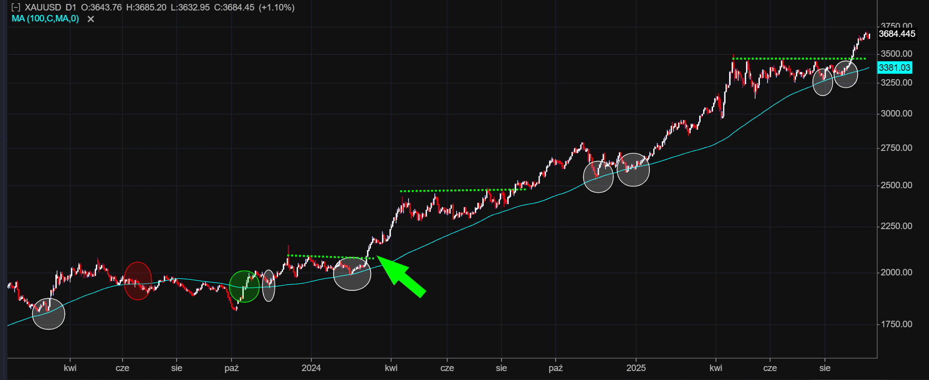 Oczywiście nie wiemy, gdzie będzie szczyt na złocie, ale naprawdę nie ma potrzeby zgadywać. Szczyt będzie tylko jeden, a trafienie w niego to iluzja, a po drugie potencjalna utrata dobrej pozycji. W ostatnim dwuletnim, dynamicznym ruchu do góry już niejednokrotnie wydawało się, że przecież jest drogo i zaraz zacznie spadać. Można było zgubić pozycję niejeden raz, a złoto urosło w tym czasie z poziomu niecałych 2000 dolarów za uncję, do obecnych 3700.